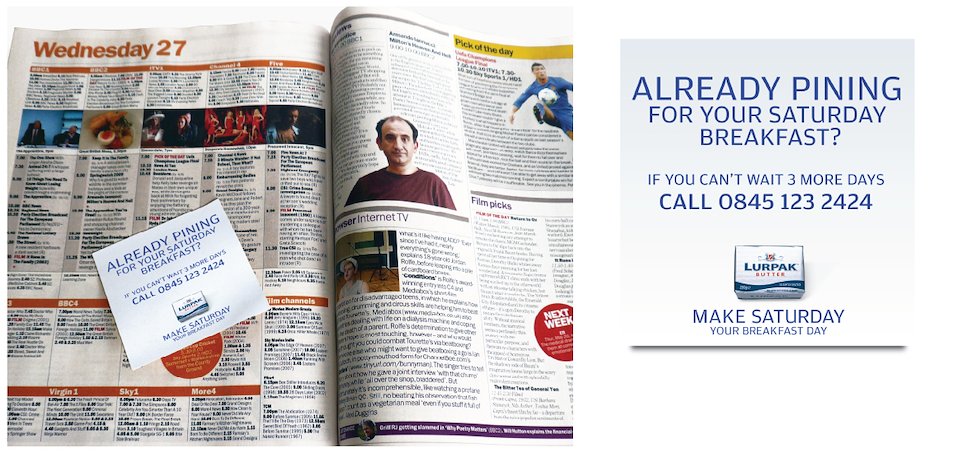 How do you make butter more than just the stuff you spread on your toast or add to mash? You create a special weekly routine based around it. Simple but effective, ‘Make Saturday breakfast day’, brought the ATL proposition TTL by encouraging the time poor, quality savvy, to make a real meal of Saturday mornings with a leisurely breakfast, guaranteed to get the weekend off to a great start.