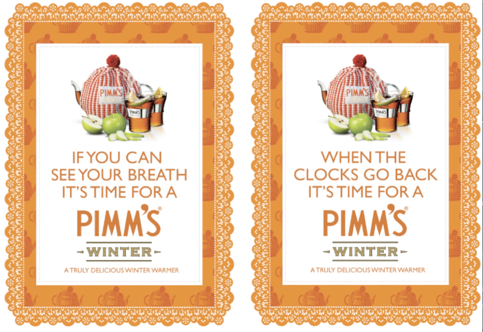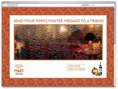 To support the experiential activity, we created press and tactical ads plus a viral email which enabled the sender write their message on the screen in virtual condensation. Writing or rubbing the screen revealed a cosy interior setting – perfect for sipping Pimm’s Winter,